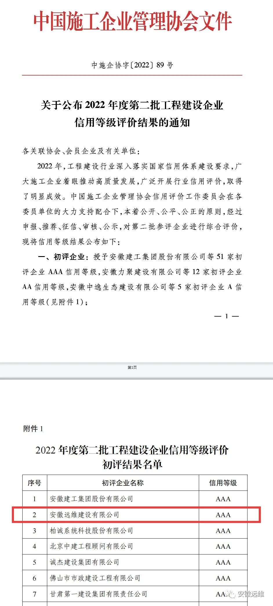 热烈祝贺安徽远维荣获“2022年度工程建设企业信用等级AAA企业”称号
