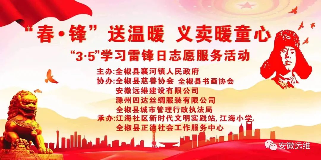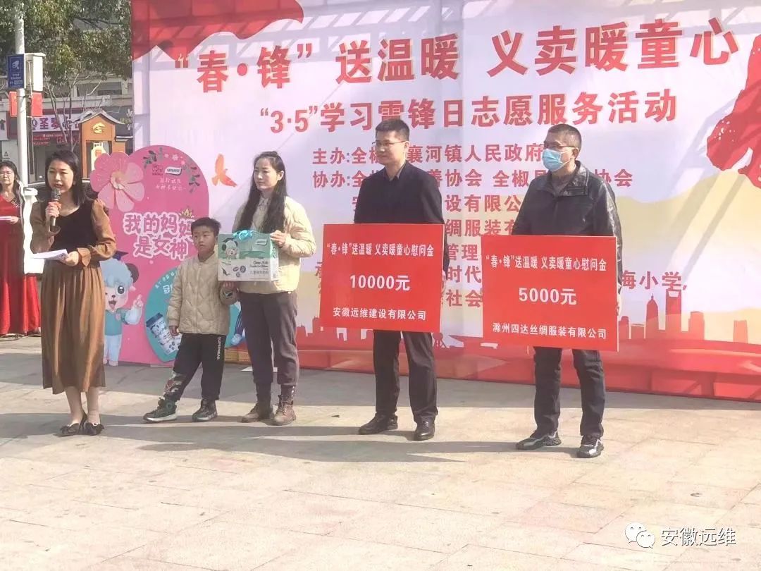 为把雷锋“奉献、友爱、互助、进步 ”的志愿服务精神代代传承下去,3月4日上午,由全椒县襄河镇人民政府主办,全椒县慈善协会及安徽远维建设有限公司等协办的”春·锋送温暖 义卖暖童心”活动在全椒县江海新城市广场举行,安徽远维建设有限公司副总经理徐晓龙代表公司参加并向活动捐献慰问金10000元。